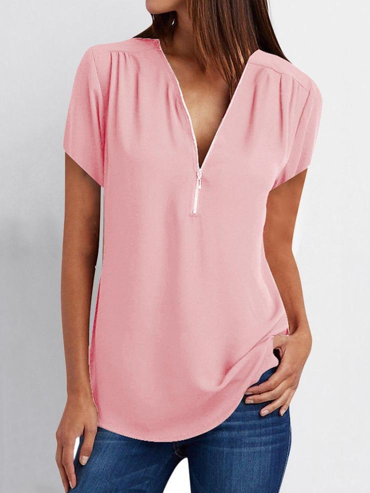 V-Neck Zip Plus Size Women’s Short Sleeve Loose Chiffon Shirt